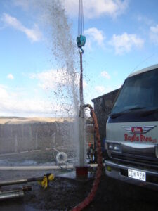 2007年6月11日 細かな砂・砂利を取除く為、パイプ口から空気を入れて、空圧で水と共に砂・砂利を洗い飛ばしています。
