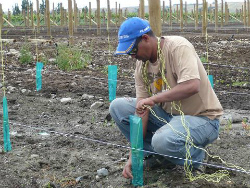 ソーヴィニヨンブランの苗を植えたブロックでは、苗に保護ビニールを被せ、苗を黄色いロープで結わえて一番上に張ったワイヤーに結んでいます。2重になったロープの間に伸びてくる主幹を巻きつけながら、上へまっすぐ伸びるよう促す役目をしています。