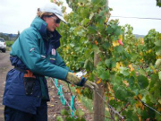 収穫の終わったピノノワールのブロックです。 鳥よけネットをはずした後、整枝をしています。