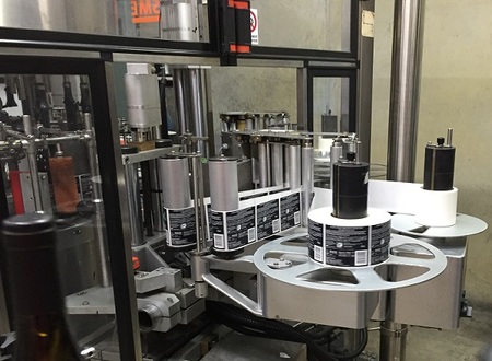 表ラベルと裏ラベルの間隔と高さが設定された機械の中で、ボトルが一回転すると同時にラベルが瞬時に貼付されます。